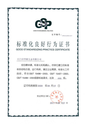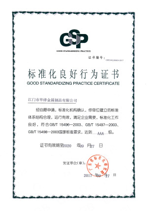 2017年9月27日,本公司之公司江門華津金屬制品有限公司(以下簡(jiǎn)稱“華津”)及江門市華睦五金有限公司(以下簡(jiǎn)稱“華睦”)收到由廣東省標(biāo)準(zhǔn)化研究院所頒發(fā)的《標(biāo)準(zhǔn)化良好行為證書(shū)》(證書(shū)編號(hào)分別為:GSP(44L)00603-2017 號(hào)及GSP(44L)00604-2017號(hào))。